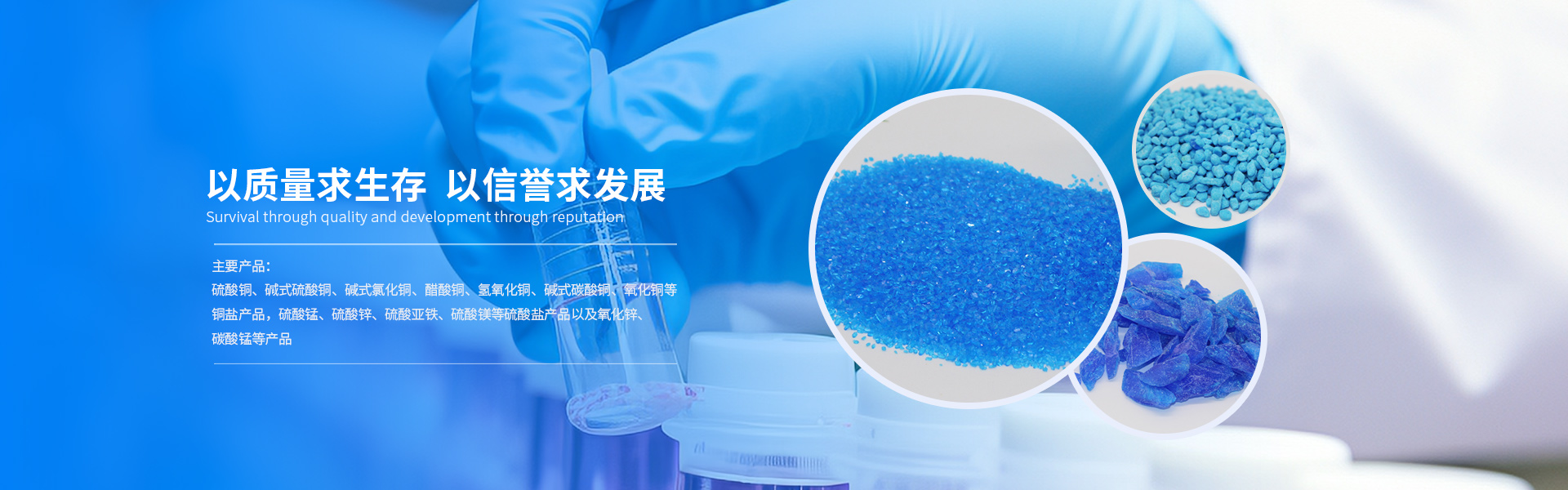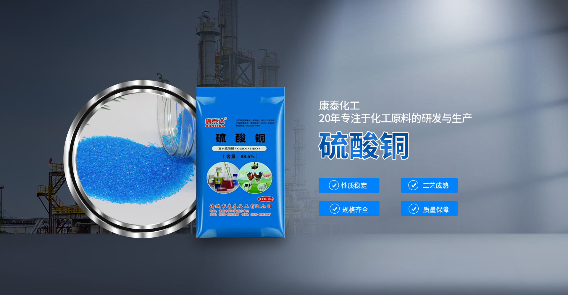 諸城市康泰化工有限公司是集科工貿于一體的綜合性高科技生產企業。公司坐落在中國龍城——山東省諸城市,地理位置優越,交通便利。主要產品有:硫酸銅、堿式硫酸銅、堿式氯化銅、醋酸銅、氫氧化銅、堿式碳酸銅、氧化銅、硝酸銅、氯化銅等銅鹽產品,硫酸錳、硫酸鋅、硫酸亞鐵、硫酸鎂等硫酸鹽產品以及氧化鋅、碳酸錳等產品,主要應用于...